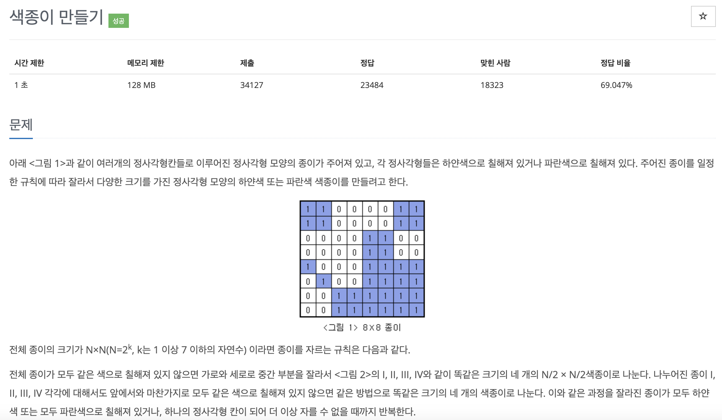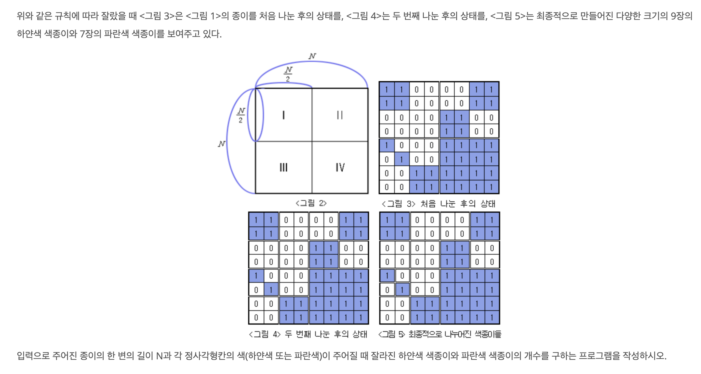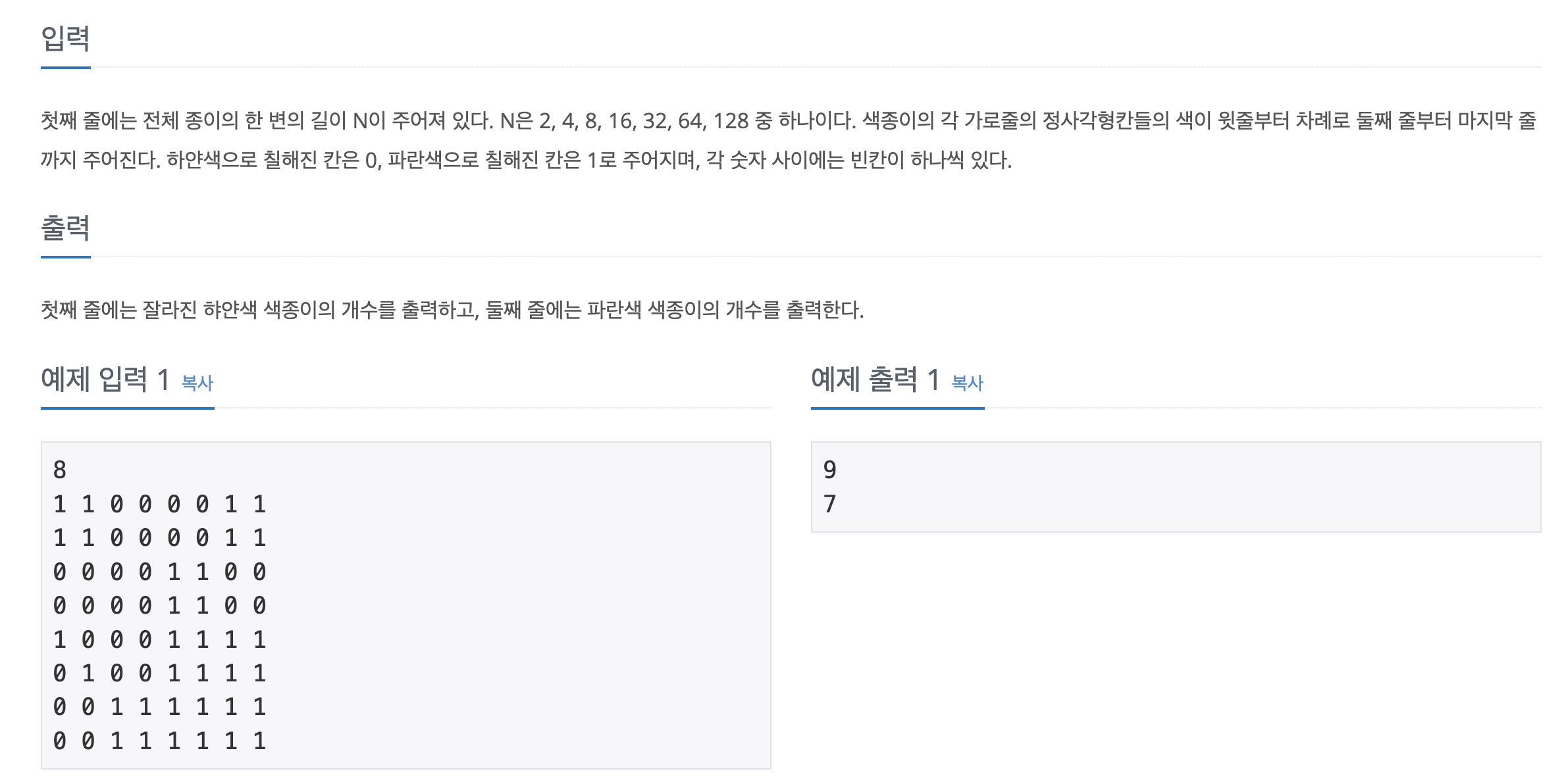 첫째 줄에는 전체 종이의 한 변의 길이 N이 주어져 있다. N은 2, 4, 8, 16, 32, 64, 128 중 하나이다. 색종이의 각 가로줄의 정사각형칸들의 색이 윗줄부터 차례로 둘째 줄부터 마지막 줄까지 주어진다.