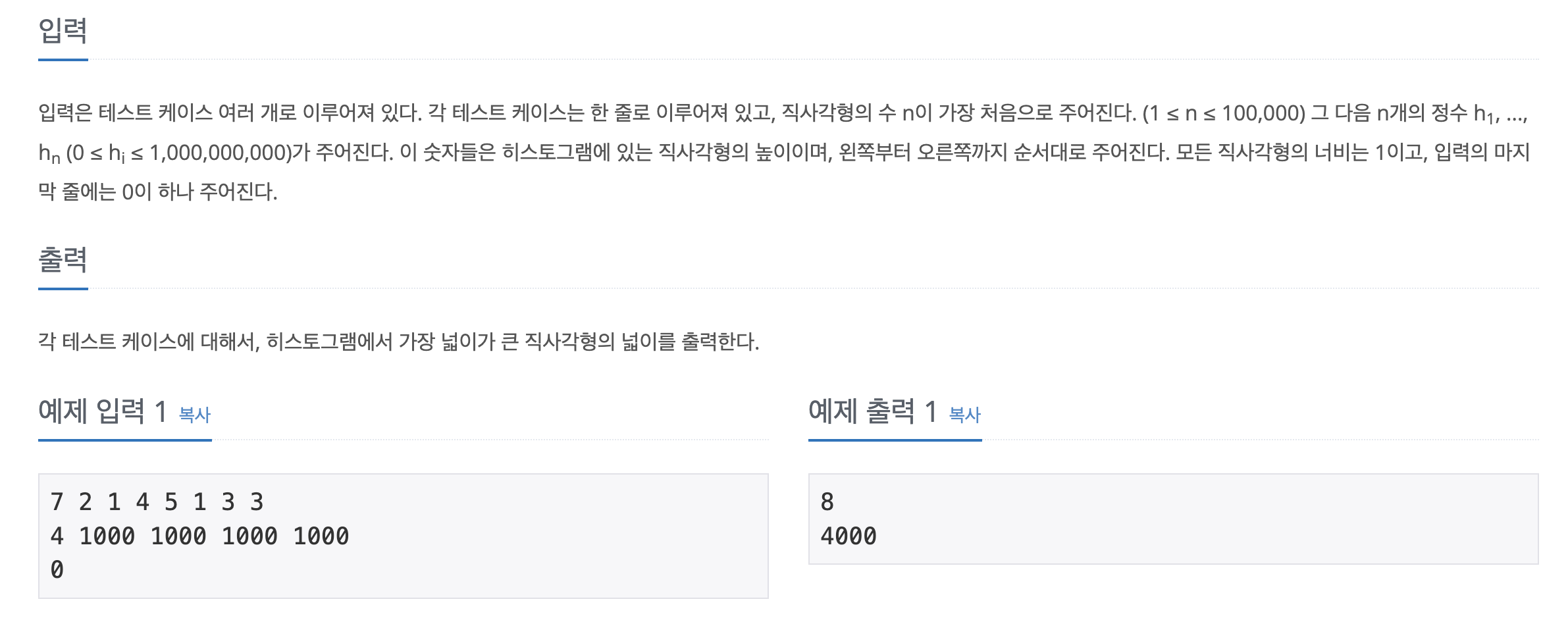 입력은 테스트 케이스 여러 개로 이루어져 있다. 각 테스트 케이스는 한 줄로 이루어져 있고, 직사각형의 수 n이 가장 처음으로 주어진다. (1 ≤ n ≤ 100,000) 그 다음 n개의 정수 h1, ..., hn (0 ≤ hi ≤