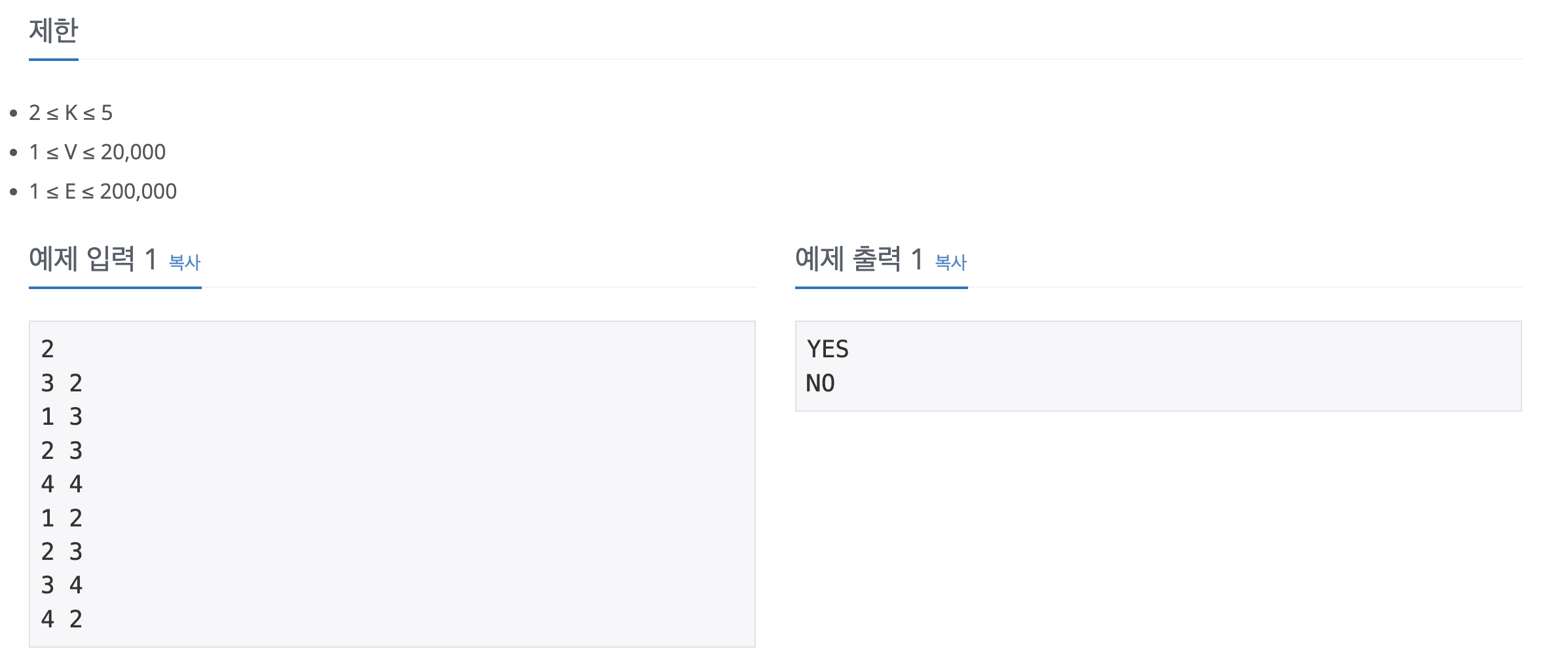 입력은 여러 개의 테스트 케이스로 구성되어 있는데, 첫째 줄에 테스트 케이스의 개수 K가 주어진다. 각 테스트 케이스의 첫째 줄에는 그래프의 정점의 개수 V와 간선의 개수 E가 빈 칸을 사이에