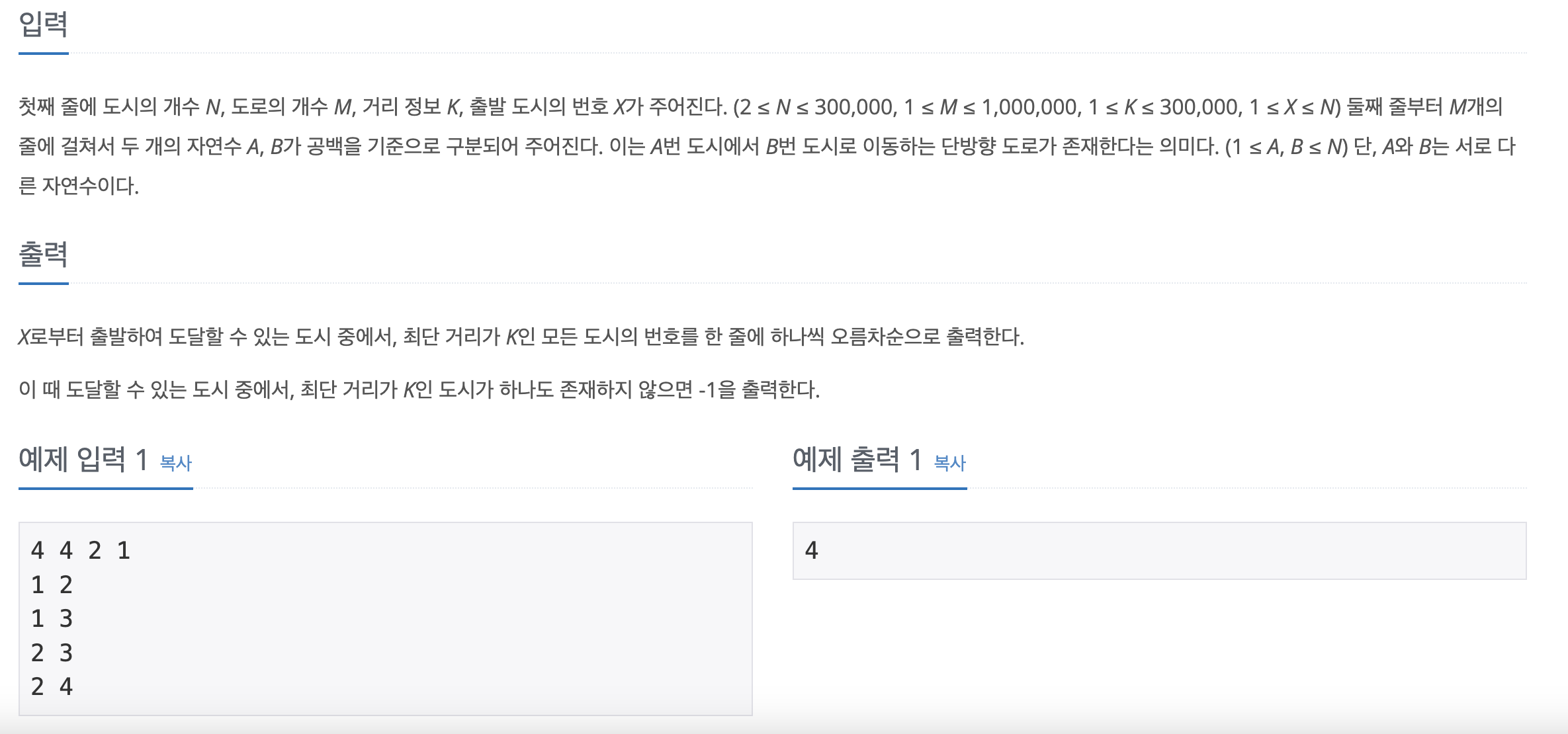 첫째 줄에 도시의 개수 N, 도로의 개수 M, 거리 정보 K, 출발 도시의 번호 X가 주어진다. (2 ≤ N ≤ 300,000, 1 ≤ M ≤ 1,000,000, 1 ≤ K ≤ 300,000, 1 ≤ X ≤ N) 둘째 줄부터 M개의 줄에 걸쳐서 두 개