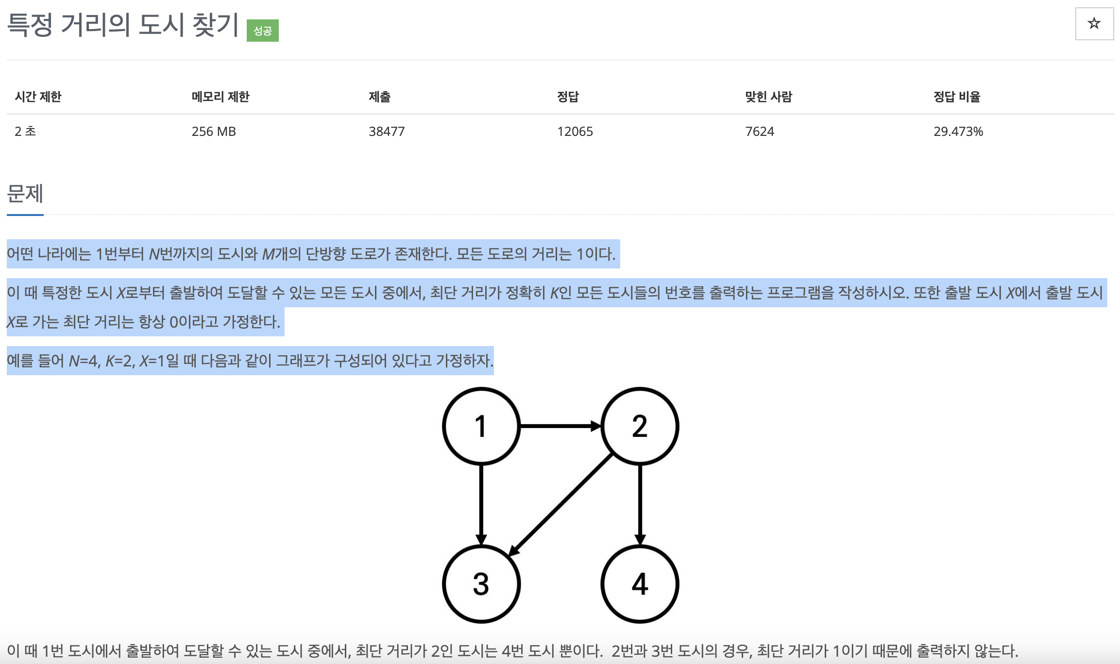 # 이떄 최단거리 K의 도시가 존재하지 않는다면 -1 출력한다.